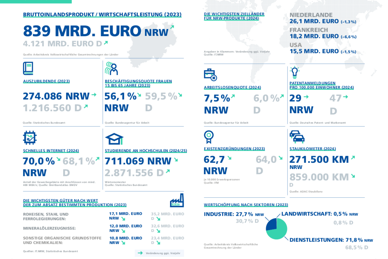 Das Bruttoinlandsprodukt ist das Maß für den Marktwert aller Güter und Dienstleistungen, die ein Land innerhalb eines Jahres produziert und stellt damit die umfassendste Messung der Gesamtleistung einer Volkswirtschaft dar. Im Jahr 2024 belief sich das Bruttoinlandsprodukt Nordrhein-Westfalens auf rund 871,9 Milliarden Euro. Dies entspricht gegenüber 2023 einem nominalen Zuwachs von ca. +2,4 %.